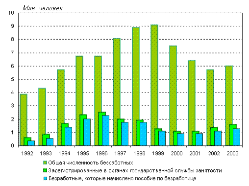 3.2. Регулирование занятости В России предстоит освоить принципиально новую модель занятости, ориентированную на формирование развитого и социально корректируемого рынка труда и использование его закономерностей. Задачи, стоящие перед государственным регулированием занятости, весьма разнообразны. Главной задачей во всем мире признается накопление и сохранение человеческою потенциала, проведение в жизнь стратегий, побуждающих людей поддерживать и модифицировать свои навыки и умения на протяжении всей жизни посредством образования и профессиональной подготовки. Основным источником финансирования политики занятости населения является Государственный фонд занятости населения. Он образуется за счет обязательных отчислений работодателей и страховых взносов с заработка работников в пределах суммы взимаемых налогов, а также средств республиканских и местных бюджетов. Для решения сложившихся проблем в рамках проведения государственной политики занятости основные усилия во второй половине 90-х годов были направлены на: ·формирование благоприятных условий для занятости населения, рабочей силы предприятий путем их экономической специализации, повышения качества и конкурентоспособности рабочей силы, развития системы обучения кадров; ·сдерживание роста численности безработных за счет организации и ·проведения опережающего переобучения и переподготовки персонала, социальной защиты работников организаций, находящихся на грани банкротства, финансовую поддержку работодателей, создающих новые рабочие места и осуществляющих профессиональную подготовку персонала; ·- реализацию федеральных и региональных мероприятий по поддержке занятости в регионах с напряженной ситуацией на рынке труда, в том числе на целевую поддержку и развитие занятости на предприятиях; ·расширение масштабов и усиление финансовой поддержки развития малого и среднего бизнеса, индивидуального предпринимательства; ·совершенствование деятельности государственной службы занятости ·по созданию условий для быстрейшего трудоустройства безработных граждан, эффективной целевой поддержки и развития лиц, потерявших работу, смягчению последствий долгосрочной безработицы, увеличению масштабов общественных и временных работ. Проводимая органами федеральной государственной службы занятости населения работа способствовала смягчению социальной напряженности и расширению возможностей трудоустройства безработных граждан. Начата работа по формированию общероссийскою банка данных вакансий для граждан, желающих переехать с целью трудоустройства в другую местность. Особенностью такого банка данных является то, что в нем содержится информация о вакансиях, для замещения которых работникам предоставляется жилье. Органами службы занятости и реализуется ряд программ: «Временная занятость населения», «Молодежная практика», «Клуб ищущих работу», «Новый старт». Как и в предшествующий период, органами службы занятости осуществляется деятельность по участию в создании эффективной системы целевой поддержки рабочих мест, направленной преимущественно на расширение возможностей гарантированного трудоустройства безработных граждан, особо нуждающихся в социальной защите, которые не могут быть трудоустроены обычным путем. По решению Правител