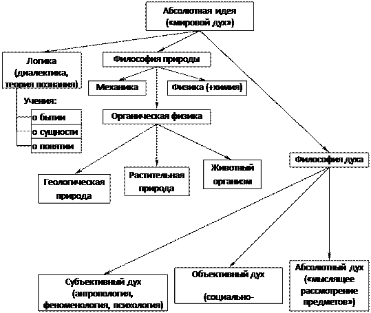 Рисунок 2. Классификация наук по Ф. Бекону. В зависимости от познавательных способностей человека (таких, как память, рассудок и воображение) он разделил науки на три большие группы: а) история как описание фактов, в том числе естественная и гражданская; б) теоретические науки, или "философия" в широком смысле слова; в) поэзия, литература, искусство вообще. В составе "философии" в широком смысле слова Бэкон выделил "первую философию" (или собственно философию), которую в свою очередь подразделил на "естественную теологию", "антропологию" и "философию природы". Антропология разделяется на собственно "философию человека" (куда входят психология, логика, теория познания и этика) и на "гражданскую философию" (т.е. политику). При этом Бэкон считал, что науки, изучающие мышление (логика, диалектика, теория познания и риторика), являются ключом ко всем остальным наукам, ибо они содержат в себе "умственные орудия", которые дают разуму указания и предостерегают его от заблуждений ("идолов"). Классификацию наук на диалектико-идеалистической основе дал Гегель[3] (рис. 3). Положив в основу принцип развития, субординации (иерархии ) форм знания, он свою философскую систему разделил на три крупных раздела, соответствующих основным этапам развития Абсолютной идеи ("мирового духа"): а) Логика, которая совпадает у Гегеля с диалектикой и теорией познания и включает три учения: о бытии, о сущности, о понятии; б) Философия природы; в) Философия духа.