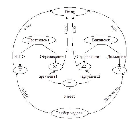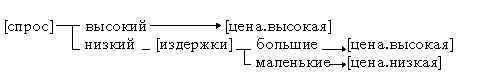 Рис. 2.3. Классификация методов представления знаний Так, объектные методы представления знаний в большей степени ориентированы на представление структуры фактуального знания, а правила - операционного. · Логическая модель реализует и объекты, и правила с помощью предикатов первого порядка, является строго формализованной моделью с универсальным дедуктивным и монотонным методом логического вывода “от цели к данным”; · Продукционная модель позволяет осуществлять эвристические методы вывода на правилах и может обрабатывать неопределенности в виде условных вероятностей или коэффициентов уверенности, а также выполнять монотонный или немонотонный вывод; · Семантическая сеть отображает разнообразные отношения объектов; · Фреймовая модель, как частный случай семантической сети, использует для реализации операционного знания присоединенные процедуры; · Объектно-ориентированная модель, как развитие фреймовой модели, реализуя обмен сообщениями между объектами, в большей степени ориентирована на решение динамических задач и отражение поведенческой модели. Логическая модель предполагает унифицированное описание объектов и действий в виде предикатов первого порядка. Под предикатом понимается логическая функция на N - аргументах (признаках), которая принимает истинное или ложное значение в зависимости от значений аргументов. Отличие заключается в том, что для объектов соответствующие реляционные отношения задаются явно в виде фактов, а действия описываются как правила, определяющие логическую формулу вывода фактов из других фактов. Пример фрагмента базы знаний подбора претендентов на вакансии в языке логического программирования ПРОЛОГ представлен на рис. 2.4. (Обозначения: ":-" - "если", "," - "и", "." - "конец утверждения"). vibor(Fio,Dolgnost):- pretendent(Fio, Obrazov, Stag), vacancy(Dolgnost, Obrazov, Opyt), Stag>=Opyt. pretendent("Иванов","среднее" 10). pretendent("Петров","высшее", 12). vacancy("менеджер", "высшее", 10). vacancy("директор", "высшее", 15). Рис. 2.4. Пример фрагмента базы знаний на языке ПРОЛОГ Механизм вывода осуществляет дедуктивный перебор фактов, относящихся к правилу по принципу "сверху - вниз", "слева - направо" или обратный вывод методом поиска в глубину. Так, в ответ на запрос vibor(X,Y) получим: X="Петров", Y="менеджер". Правила могут связываться в цепочки в результате использования одинакового предиката в посылке одного и в заключении другого правила. Для логической модели характерна строгость формального аппарата получения решения. Однако, полный последовательный перебор всех возможных решений может приводить к комбинаторным взрывам, в результате чего поставленные задачи могут решаться недопустимо большое время. Кроме того, работа с неопределенностями знаний должна быть запрограммирована в виде самостоятельных метаправил, что на практике затрудняет разработку баз знаний с помощью логического формализма. Продукционные модели используются для решения более сложных задач, которые основаны на применении эвристических методов представления знаний, позволяющих настраивать механизм вывода на особенности проблемной области и учитывать неопределенность знаний. В продукционной модели основной единицей знаний служит правило в виде: "если <посылка>, то <заключение>", с помощью которого могут быть выражены пространственно-временные, причинно-следственные, функционально-поведенчес