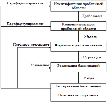 Первые два этапа разработки экспертной системы составляют логическую стадию, не связанную с применением четко определенного инструментального средства. Последующие этапы реализуются в рамках физического создания проекта на базе выбранного инструментального средства. Вместе с тем, процесс создания экспертной системы, как сложного программного продукта, имеет смысл выполнять методом прототипного проектирования, сущность которого сводится к постоянному наращиванию базы знаний, начиная с логической стадии. Технология разработки прототипов представлена в таблице 2.2. Таблица 2.2.