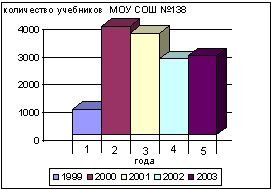 Проведен анализ (табл. 9)., можно сказать, что в течение 5 лет, даже при уменьшении количество детей, проблема загруженности кабинетов не решилась. Школа работает в режиме 6-дневной учебной недели с 3 по 11 класс, 1,2 классы - в режиме 5- дневки. Расписание уроков соответствует санитарно-гигиеническим нормам, перегрузки у учащихся нет. В 1984 году был открыт кабинет информатики и ОВТс 12 машинами «Роботрон», в 1993 году устаревшие «Роботроны» заменены на IBM- 386 (9 машин), в 1996 году получена IBM- 486 (1 машина) и одна Пентиум- II. В 2001 году были подключены к сети Интернет. Не выполняется нормативное требование об изучении информатики так как, учащимся приходится познавать основы информатики с 8 класса (по выбору педагога), а должны преподаваться со 2 класса. Сложное положение зафиксировано по эксплуатации спортивного зала. Спортивный зал имеет площадь 3471,1 кв.м. по нормативам предназначен для занятия одного класса. В спортивном зале занимается, иногда по 2 класса. На территории школьного двора расположены две спортивные площадки, корт. Анализируя это можно сделать вывод, эти все сооружения не обеспечивают выполнения нормативов для занятий физической культурой. Для организации питания в школе имеется столовая и буфет. Площадь столовой 124 кв.м. число посадочных мест на 200 человек. Численность обучающихся, пользующихся организованным питанием. 815 учащихся, из них через буфет 300. Всего обеспечено питанием 69%. В школе есть библиотека, где работают 2 специалиста, на 2003-2004 год число книг (включая школьные учебники), брошюр и журналов -25555 экземпляров, и школьных учебников составляет.-125252 экземпляров. На 2004-2005 г. число книг (включая школьные учебники), брошюр и журналов -32282экземпляров и школьных учебников составляет.-19185 экземпляров. Качественный уровень обеспечения учебниками, художественной литературой предоставлен на (рис. 5).