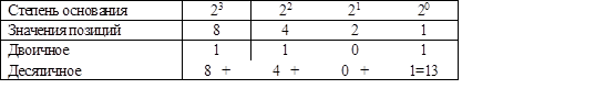 Двоичные числа Цифровые устройства работают с двоичными числами. Двоичная система счисления или система с основанием 2 использует только цифры 0 или 1 . Эти двоичные числа называют битами (от binary digit ). Система счисления - это код, в котором используют специальные символы для обозначения количества каких-либо объектов. В повседневной деятельности мы пользуемся десятичной системой счисления, которая содержит десять цифр (от 0 до 9 ). Такую систему ещё называют системой счисления с основанием 10 . Двоичную систему называют системой счисления с основанием 2 . Системы счисления характеризуются таким понятием, как значение позиции или вес разряда. Например, десятичное число 2547 можно представить как сумму 2000+500+40+7=2547 . Составляющие этой суммы и являются весами разрядов. Рассмотрим двоичное число 1101 ("один - один - ноль - один"). В табл.10.1 приведены значения позиций и десятичный эквивалент двоичного числа. Таблица 10.1. Значения позиций двоичных чисел