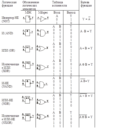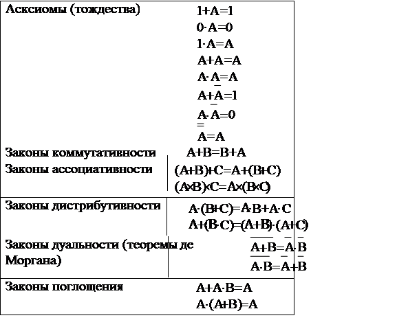 В табл.10.7 для графического обозначения логических элементов приведены две системы - система, рекомендуемая Международной Электротехнической Комиссией (МЭК), и американская система milspec. Для описания связи входов и выходов логических элементов используются булевы функции. Основы математической логики были заложены английским математиком Дж. Булем (1815 - 1864). В табл.10.7 для задания булевых функций использовались четыре логические функции: 1) функция НЕ или инверсия (отрицание) Y= 2) функция И (конъюнкция) Y=A·B=AB 3) функция ИЛИ (дизъюнкция) Y=A+B=AB 4) функция исключающее или Y=AB Для перечисленных логических функций справедлив ряд аксиом (тождеств) и законов, основные из которых приведены в табл.10.8. Таблица 10.8. Основные аксиомы и законы булевой алгебры