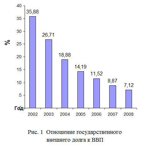 Динамика этого показателя представлена на рис.1. Вместе с тем в структуре госдолга России при некотором снижении внешней задолженности наблюдается рост внутренних и "новых" внешних долговых обязательств. С экономической точки зрения это свидетельствует о начале реализации стратегической концепции в области госдолга, суть которой заключается в постепенном стирании разделения долговых обязательств на внешние и внутренние. Госдолг становится все более единым, и управление финансовыми обязательствами государства переходит к единому центру. Показатель "государственный долг/доходы" используется международными финансовыми организациями для оценки долговой устойчивости суверенного заемщика, т. е. такого состояния государственного внешнего долга, при котором правительство выполняет обязательства по его обслуживанию в полном объеме без ущерба темпам экономического и социального развития и необходимости прибегать к списанию или реструктуризации задолженности. Поскольку внешняя задолженность фиксируется, погашается и обслуживается в иностранной валюте, то важным показателем платежеспособности страны наряду с объемом и темпами роста ВВП является экспорт товаров и услуг. Коэффициент "внешний долг/экспорт" является индикатором состояния долга, отражающим имеющиеся возможности страны погасить его накопленный объем. Чем более развит экспортный сектор национальной экономики, тем больше у дебитора возможностей выполнять имеющиеся долговые обязательства перед внешними кредиторами и, соответственно, меньше значение данного показателя. Страны делятся на три группы: с высоким, средним и низким уровнем внешней задолженности. К I группе - страны, у которых первый показатель выше 80% или второй превышает 220%. Для II - колеблются в интервале соответственно между 80 и 48%, 220 и 132%. А третья - страны с небольшим объемом задолженности - менее 48 и 132% соответственно.[6; С.65] Валютная составляющая госдолга для бюджетной системы страны наиболее опасна, так как продолжающаяся девальвация национальной валюты неизбежно ведет к удорожанию самого долга и его обслуживания. В 2000г. удельный вес внешнего госдолга РФ в объеме ВВП и экспорта составлял соответственно 57,3 и 140,7%. Эти показатели по критериям Всемирного банка соответствовали странам с высоким уровнем внешней задолженности. В 2005году Россия перешла к странам с низким уровнем внешнего долга. Международные финансовые организации часто пользуются показателем "резервы/платежи по внешнему долгу", являющимся важнейшим индикатором потенциальных проблем страны с ликвидностью - способностью правительства и резидентов своевременно выполнять обязательства по внешнему долгу, сохранять достигнутый уровень кредитного рейтинга и доступ на международные финансовые рынки. Критическим значением является уровень в 100%, отражающий равенство официальных резервов и объема срочного в течение года внешнего долга. Меньшие значения показателя указывают на вероятность того, что либо правительство, либо резиденты страны прекратят обслуживать или погашать срочный в текущем (отчетном) году долг из-за нехватки доступной иностранной валюты. Золотовалютные резервы РФ в 2005г. составили 138,9 млрд. долл., а платежи по погашению и обслуживанию государственного внешнего долга - 17,15 млрд. долл. "Резервы/платежи по внешн