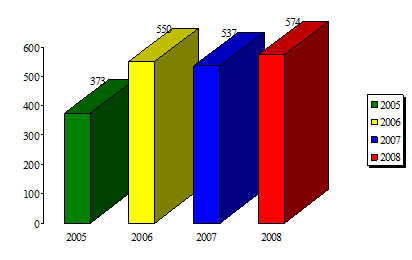 Рис. 8. Общее количество пролеченных пациентов хирургического профиля в ОАР №2 в 2005–2008 гг. Таким образом, можно сделать вывод: наибольшее количество пролеченных пациентов приходится на отделения урологического и гинекологического профилей. Причем, если количество пациентов урологического профиля с каждым годом растет, то количество пациентов гинекологического профиля снижается. Стабильным остается количество пациентов с хирургической инфекцией, проктологии и ЧЛХ. Наглядно % количество пролеченных пациентов от общего числа пациентов с хирургической патологией представлено в таблице 5. Таблица 5. Количество пролеченных пациентов % в ОАР №2 с различной хирургической патологией в 2005–2008 годах