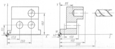 Для обработки следующих отверстий по заданному циклу G82 достаточно теперь программировать только перемещения по осям X и Y. В кадрах, где изменяется координата z(центрование отверстий 3—5), следует ее указать. Естественно, что указанная в кадре N7 величина zотрабатывается в последующих кадрах тоже: N6Х180. Y105. LF N7Х135. Y125. Z341.5 LF N8Х82.3 Y155.31 LF N9Х82.5 Y94.69 LF N10Х100. Y125. L.F N11 G80 Т0202 LF Кадр N11 отменяет цикл G82 и задает новый инструмент. 3.5 Упрощенная методика программирования сверлильных операций Рассмотренная методика программирования сравнительно сложна, требует пересчета некоторых размеров, а главное, определения и учета вылета инструмента в процессе программирования. Ее применяют, когда действительные вылеты инструментов мало отличаются от расчетных, когда применима система предварительной регулировки вылета инструмента в специальных приспособлениях. Программирование становится значительно проще, если использовать возможности УЧПУ по смещению нуля и вводить коррекцию на инструмент в период наладки (настройки) станка исходя из действительного его вылета. Это не только облегчает кодирование информации, но в значительной мере упрощает составление РТК (рис. 8.6): нет необходимости задаваться вылетом инструментов, не нужен пересчет координат точек из системы координат детали в систему координат станка и т. д. Все это объясняется тем, что нуль станка смещается в начало координат до тали (из точки М в точку W) и отсчет программируемых перемещений и процессе отработки УП ведется от точки W, т. е. так, как это задано на чертеже детали. Кроме того, при настройке станка вылет каждого инструмента вводится (с обратным знаком) в корректор этого инструмента. Делается это просто. Инструмент доводят до касания вершины Р с верхней плоскостью заготовки, установленной в приспособлении. На табло, предназначенном для индикации перемещения по оси Z, высвечиваются цифры, определяющие расстояние от плоскости нового нуля до базовой точки шпинделя, т. е. величина zWN — l. А это и есть действительный вылет инструмента (например, для сверла диаметром 16 мм он равен 172 мм). Если теперь на корректоре инструмента набрать величину zWN — l(172 мм), то на табло индикации по оси Z будут нулевые показания, т. е. базовая точка N совместится с вершиной Р инструмента. Подобную настройку (с касанием инструмента острием или торцом поверхности детали) проводят для каждого инструмента, и значения соответствующих вылетов набирают на соответствующих корректорах. Таким образом, для всего набора инструментов на данную операцию справедливо положение: при нахождении вершины инструмента в плоскости нового нуля табло индикации по оси Z показывает нули. При настройке достаточно просто также совмещать ось шпинделя с началом координат детали. Подготовка УП по упрощенной методике. Приняв во внимание сказанное выше, программу обработки рассматриваемой детали можно представить следующим образом: % LF N1 G60 G80 Т0101 LF N2F40. S500 М06 LF N3 G59 ХЗО. Y85. Z175. LF В кадрах N1 — N3 задают инструмент Т01, условия его работы и указывают на смещение нуля (G59) по трем осям. N4Х20. Y20. LF N6 G82 R2. Z-6.LF В кадре N5 задают постоянный цикл и шипения параметров в соответствии со схемой на рис. 2, а В кадре N7 дают команды на позиционирование в точку 3 и исполнение заданного цикла (G82) с новым значением z(—3,5 мм). N8Х52.5 Y70.31 LF N9Y9.69 LF N10Х70. Y40. LF N11 G80 ТО202 LF Кадр N11 заверша