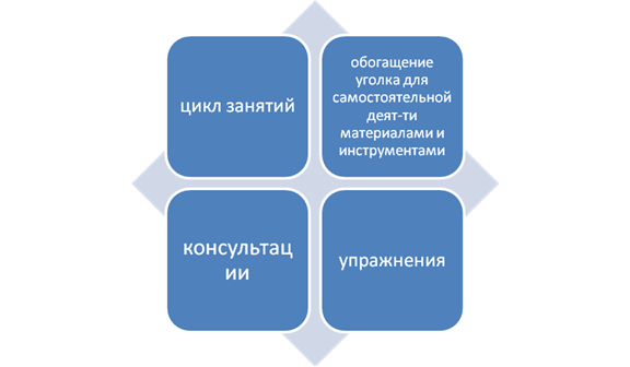 Таким образом, проведенная экспериментальная работа позволила сделать следующий вывод: педагогический процесс ДОУ способствует формированию художественно-творческих способностей детей. Однако не все дети хорошо владеют техникой рисования (в том числе нетрадиционными техниками ), что естественным образом негативно сказывается на проявление творчества. Обобщение выше изложенного позволило наметить эффективные пути развития художественно-творческих способностей детей. 2.2 Система работы, направленная на развитие художественно-творческих способностей детей. Главной целью преобразующего этапа являлась разработка и внедрение серии занятий, направленных работы на формирование художественно-творческих способностей детей старшего дошкольного возраста. Разработанная на основе теоретического анализа и проведенного эксперимента система работы включила следующие формы работы: