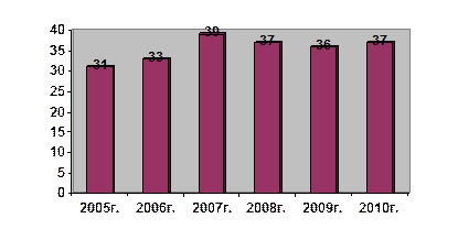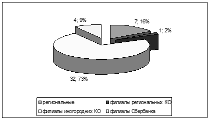 Всего по региональному банковскому сектору Калининградской области на 01.07.2010 года задолженность по выданным кредитам экономике составила 85 140,4 млн руб., а денег, находящихся на счетах и депозитах юридических лиц, привлечено 26 641,5 млн руб. Из данных таблицы следует, что все кредитные организации региона вкладывают в экономику региона больше средств, чем аккумулируют в виде депозитов юридических и физических лиц. Но, как показал более детальный анализ, эта ситуация характерна не для всех филиалов иногородних банков, часть из них «откачивает» средства из региона, перераспределяя их через головные офисы. По состоянию на 01 июля 2010 года на территории Калининградской области действовало 5 региональных банков с 1 филиалом и 36 филиалов иногородних кредитных организаций, включая 3 филиала Сбербанка России (рисунок). Благодаря этому достигнута высокая насыщенность региона банковскими институтами – на 100 тыс. человек, постоянно проживающих на территории области, приходится более 4,5 кредитных организации, что является самым высоким показателем среди регионов Северо-Западного федерального округа. Банковский сектор области динамично развивается, эффективно трансформируя депозитные средства населения и предприятий в кредиты. Повышается его роль в экономике региона. Рисунок 4. Количество действующих кредитных организаций в Калининградской области.