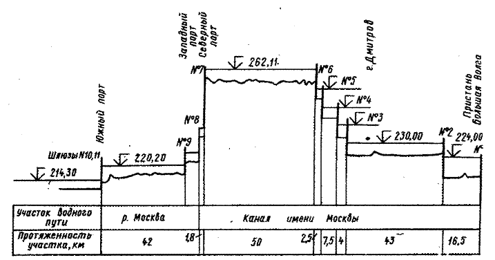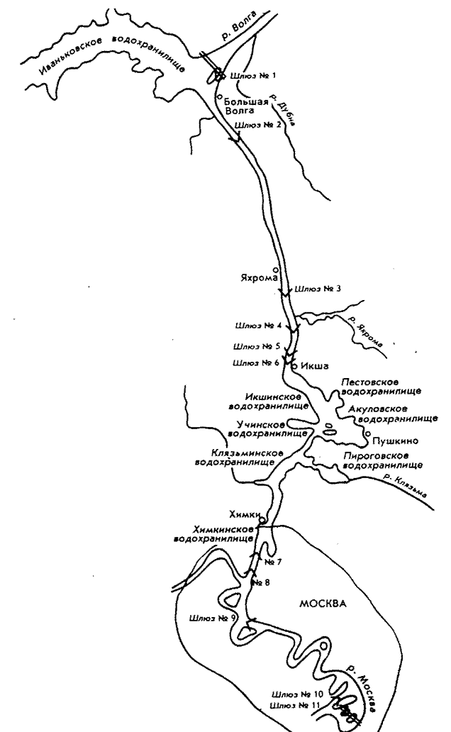 Канал имени Москвы был построен в 1932—1937 гг. и является сооружением, комплексно решающим несколько крупных водохозяйственных задач: водоснабжение столицы, обеспечение воднотранспортной связи с р. Волгой, улучшение санитарного состояния рек в пределах города, выработка электроэнергии на попутных и оставшихся расходах воды, а также создание зон отдыха. Трудно переоценить значение канала имени Москвы в жизни столицы. Канал не только открыл большое судоходство в Москву, но и обеспечил город водой. Сегодня его насосные станции подают Московскому водопроводу половину всей потребляемой населением и промышленными предприятиями воды. Волжские воды сделали р. Москву полноводной. Берега канала и его водохранилища стали основной зоной отдыха. Экономическое развитие Москвы и Московского государства в прошлом в значительной мере было связано с р. Москвой, служившей связующим звеном в общей системе водных путей. Первый проект создания искусственного водного пути, соединяющего р. Москву с Верхней Волгой, появился в 1674 г. Первая попытка соединения рек Волги и Москвы была сделана в 1825 г. при Николае I. Канал намечался через р. Истру и Сенежское озеро с выходом в р. Сестру и предназначался для подвозки строительных материалов водным путем с верховьев Волги. Когда работы были наполовину выполнены, началась постройка Николаевской железной дороги, что и решило дальнейшую судьбу канала. Строительство было прекращено, а все его сооружения и отчужденные для него земли проданы с публичных торгов. После изучения возможных вариантов водоснабжения Москвы Пленум ЦК ВКП (б) 15 июня 1931 г. принял решение о необходимости коренным образом разрешить задачу обводнения Москвы-реки путем соединения ее с верховьем Волги и поручил московским организациям совместно с Госпланом и Наркомводом немедленно приступить к составлению проекта этого сооружения с тем, чтобы уже в 1932 г. начать строительные работы по соединению Москвы-реки с Волгой. Для проектирования и подготовки к строительству при Моссовете было создано Управление Москаналстрой. Первоочередной задачей проектировщиков был выбор наиболее целесообразной схемы и трассы канала. В форме схематического проекта было проработано три варианта соединения Волги с р. Москвой: 1. Старицкий вариант. Начало канала намечалось от с. Родня (12 км выше г. Старицы) к Волоколамску, далее мимо г. Клина и через водораздел у Сенежского озера с выходом к р. Москве у с. Тушино. Благодаря высоким отметкам Волги в месте начала канала по сравнению с отметками р. Москвы это направление допускало подачу воды в город самотеком. Топографические условия местности позволяли поднять уровень воды в реке на 36,5 м путем ее подпора, при этом подпор распространялся вверх по течению на 150 км с образованием водохранилища объемом 2,5 млрд. мЗ. По выходе из водохранилища канал должен был прорезать правый высокий берег Волги и, направляясь далее на восток по северному склону водораздела на г. Клин, пересечь верховья рек Шоши, Лоби, Ламы. Минуя г. Клин, канал прорезал глубокой (33—34 м) выемкой Клинско-Дмитровскую гряду с выходом к р. Истре. Далее канал шел по долине р. Истры и впадал в Истринское водохранилище, образуемое земляной плотиной. Это водохранилище предполагалось использовать одновременно для судоходства и для отстаивания воды перед подачей 