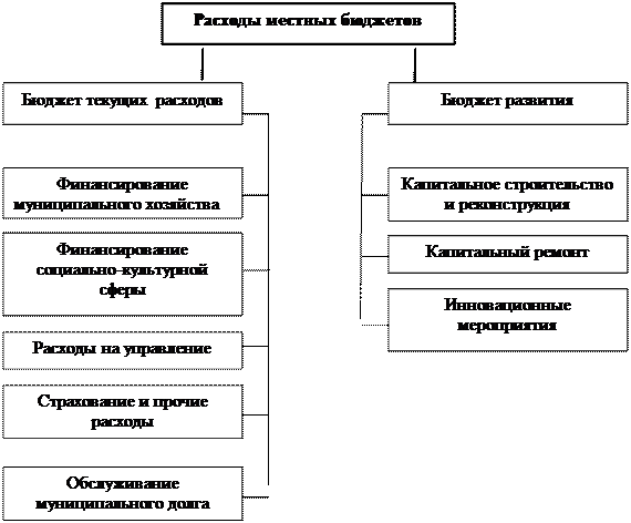 Рисунок 2. Расходы местных бюджетов Самыми крупными статьями расходов большинства местных бюджетов являются расходы на жилищно-коммунальное хозяйство, образование и здравоохранение. В некоторых муниципальных образованиях на эти три статьи расходуется до 75-80% бюджетных расходов. В перспективе структура расходов будет меняться. В частности, будут сокращаться расходы на финансирование жилищно-коммунального комплекса в связи с передачей бюджетных средств на эти цели от жилищно-эксплуатационных организаций к гражданам, причем выплата жилищных субсидий будет финансироваться через федеральный бюджет и бюджеты субъектов РФ. Расходы на образование и здравоохранение будут сосредоточены в бюджетах муниципальных районов и городских округов, а расходы на финансирование образовательного процесса, включая заработную плату педагогических работников, передаются на уровень субъектов РФ. В бюджете текущих расходов могут выделяться «защищенные статьи», по которым сокращение расходов недопустимо ни при каких обстоятельствах. К таким статьям обычно относятся расходы на заработную плату, оплату коммунальных и транспортных услуг бюджетных организаций, питание в бюджетных учреждениях (больницы, детские учреждения и др.), медикаменты, выплату пособий и компенсаций и пр. Средства бюджета развития расходуются на капитальное строительство, капитальный ремонт и иные инновационные мероприятия. В условиях экономического кризиса и дефицита средств на текущие расходы большинство муниципалитетов сегодня не в состоянии сформировать бюджет развития и все имеющиеся у них средства направляют на неотложные текущие нужды. Но и в экономически благополучных странах прямые бюджетные расходы на цели развития обычно невелики, и основная доля средств формируется за счет муниципальных займов. Среди возможных путей сокращения расходов местных бюджетов можно выделить: · повышение эффективности работы муниципальных предприятий и учреждений, снижение их дотационности; · усиление контроля за расходованием бюджетных средств; · привлечение частного бизнеса к оказанию отдельных видов услуг; · нормирование расходов на оказание отдельных видов муниципальных услуг; · конкурсное размещение муниципального заказа; · установление экономически обоснованных цен и тарифов на муниципальные услуги, расширение спектра платных услуг; · поддержка, а в отдельных случаях прямое финансирование внедрения ресурсосберегающих технологий в городском хозяйстве. Муниципальные образования должны стремиться к построению сбалансированных бюджетов, в которых размеры доходов и расходов совпадают. Бюджетный кодекс РФ допускает размер дефицита местного бюджета, утвержденного представительным органом местного самоуправления на очередной финансовый год, не более 10% объема доходов бюджета (без учета финансовой помощи из бюджетов других уровней). Одновременно должны быть утверждены источники покрытия этого дефицита, в числе которых могут быть муниципальные займы, кредиты, ссуды, поступления от продажи муниципального имущества и другие источники, установленные законодательством. Для большинства муниципальных образований достижение устойчивых, прогнозируемых и сбалансированных бюджетов практически невозможно. Это объясняется тем, что доля собственных доходов м