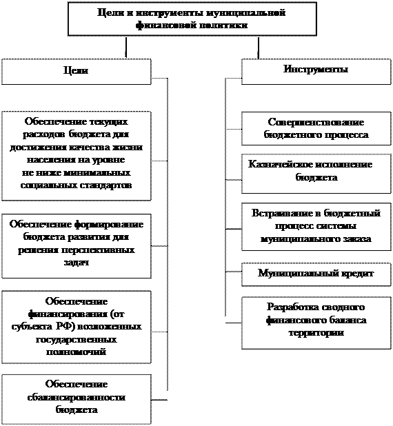 Рисунок 3. Цели и инструменты муниципальной финансовой политики Ниже рассматриваются отдельные методы и инструменты достижения этих целей. Бюджетный процесс. Бюджетный процесс в муниципальном образовании – это деятельность органов местного самоуправления по составлению и рассмотрению проекта муниципального бюджета, его утверждению, исполнению и контролю за исполнением. Эффективная организация бюджетного процесса на всех его стадиях позволяет привлекать в бюджет дополнительные источники доходов и обеспечивать экономное расходование бюджетных средств. Бюджетный процесс регламентируется нормами Бюджетного кодекса РФ и осуществляется органами местного самоуправления самостоятельно. Обычно в муниципальном образовании принимается местный нормативный акт – положение о бюджетном процессе, регламентирующее порядок и сроки разработки, утверждения, исполнения, контроля и отчетности об исполнении бюджета. Проект местного бюджета разрабатывается администрацией муниципального образования. Для разработки проекта бюджета необходим ряд исходных данных: · прогноз социально-экономического развития муниципального образования; · план развития муниципального сектора экономики; · оценка потерь бюджета от предоставления налоговых льгот; · проекты муниципальных целевых программ на очередной финансовый год; · прогноз налоговых и неналоговых поступлений; · структура муниципального долга и программа муниципальных заимствований на очередной финансовый год; · основные направления бюджетной и налоговой политики; · прогноз финансового баланса территории; · оценка ожидаемого исполнения за текущий финансовый год; · перечень местных нормативных актов или их частей, действие которых должно быть приостановлено на очередной финансовый год в связи с нехваткой средств [8, c. 230]. Для составления проекта местного бюджета необходимы также сведения о нормативах отчислений в местный бюджет от федеральных и региональных налогов и сборов, о предполагаемых объемах финансовой помощи из бюджетов других уровней, о дефляторах (ценовых коэффициентах роста финансовых затрат по сравнению с текущим годом). Эти сведения, если они не содержатся в действующем налоговом и бюджетном законодательстве, должны быть заблаговременно получены от финансового органа субъекта РФ. Разработанный проект местного бюджета вносится главой администрации на рассмотрение и утверждение в представительный орган местного самоуправления. К проекту бюджета прилагается специальный документ – бюджетное послание, в котором глава администрации обосновывает объемы доходов и направления расходования бюджетных средств с учетом целей и задач жизнеобеспечения и социально-экономического развития муниципального образования. Рассмотрение бюджета в представительном органе обычно происходит в два или три этапа (чтения). На первом этапе проект бюджета рассматривается в комитетах и комиссиях, а затем на заседании представительного органа, где заслушивается бюджетное послание главы администрации. После этого бюджет принимается в первом чтении, т.е. согласовываются его основные параметры. Для рассмотрения возможных разногласий по проекту между администрацией и представительным органом создается согласительная комиссия. Проект бюджета, принятый в первом чтении, пуб