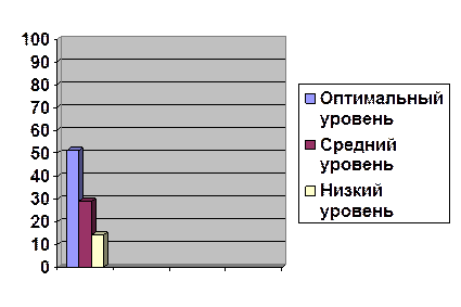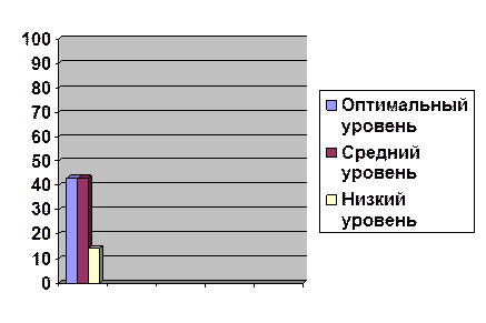 По данному рисунку можно сделать вывод: · оптимальный уровень показало 57,1% испытуемых. Дети, относящиеся к данному уровню, при воспроизведении не называли не более 2 слов, при просьбе повторить выученные ранее, повторяли 5-6 слов. Паша К. запомнил 9 слов из 10 при троекратном повторении, при отсроченном воспроизведении вспомнил 6 слов. Всем испытуемым потребовалось не более 5 повторений для того, чтобы воспроизвести не менее 8 слов. Почти все дети произносили слова в том порядке, в котором они были даны экспериментатором, с небольшими перестановками. Марина Н. не запомнила 2 слова, а при повторении назвала 7 слов, однако называла слова не по порядку, с большими паузами, припоминала. · средний уровень показало 28,6% испытуемых. Дети воспроизводили не менее 5 слов, отсроченное воспроизведение – не менее 4 слов. Число повторений составило 5 раз. Дети воспроизводили слова в большинстве случаев по порядку, хотя наблюдались небольшие перестановки. Исходя из полученных результатов можно сказать, что у большей части испытуемых довольно хорошо развита слухоречевая память. Это связано с недостатками зрения, которые способствуют развитию компенсаторных механизмов слухового анализатора. · низкий уровень показало 14,3% испытуемых. Дети, относящиеся к данному уровню смогли запомнить менее 5 слов, а на просьбу повторить выученные ранее слова, повторяли 1 слово или говорили, что не помнят слов вообще. 2. «Методика исследования мотивации учения у первоклассников» Методика исследования мотивации учения позволила выявить следующие результаты. Рисунок 2. Уровень развития школьной мотивации у детей с нарушениями зрения.