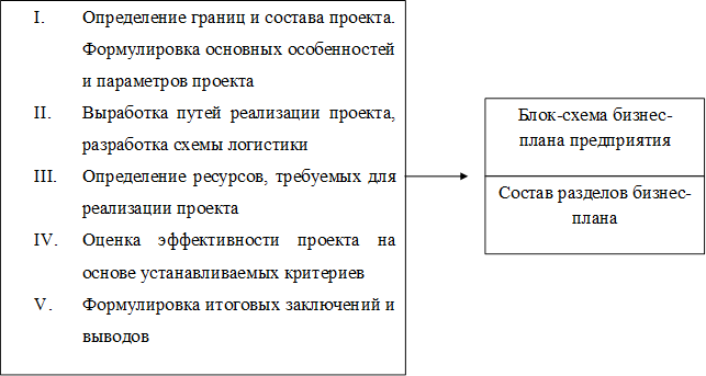 Наибольшее сокращение объема инвестиций в основной капитал на МП с учетом ИПЦ наблюдается в Ненецком АО (на 90,1%), а также в Новгородской (на 88,2%) и Курской (на 85,7%) областях. Основные выводы1. По итогам первого полугодия 2010 года по сравнению с аналогичным периодом прошлого года в целом по стране по всем рассматриваемым показателям развития малого предпринимательства, за исключением оборота малых предприятий, отмечается негативная динамика. 2. На 1 июля 2010 года количество зарегистрированных малых предприятий в целом по России уменьшилось по сравнению с 1 июля предыдущего года на 3,6%, среднесписочная численность занятых на МП снизилась на 3,3%, а доля занятых на МП в общей среднесписочной численности занятых сократилась на 0,1 п.п. Кроме того, на 15,3% снизился объем инвестиций в основной капитал на МП. На фоне негативной динамики указанных показателей объем оборота малых предприятий в первом полугодии 2010 года оказался на 8,1% выше показателя за аналогичный период прошлого года. 3. Итоги деятельности малых предприятий в январе-июне 2010 года в региональном разрезе можно рассматривать как умеренно позитивные. В 46 регионах увеличилось количество зарегистрированных МП; увеличение среднесписочной численности занятых на МП было отмечено в 44 регионе, объемов оборота МП – в 63 регионах; инвестиций в основной капитал на МП – в 33 регионах. 1.2. Понятие и сущность современного бизнес - планирования Планирование как система волевых, сознательно принимаемых решений регулирует рынок во внутренней деятельности фирмы. Осуществляя административную функцию, связанную с волевым руководством и принятием решений, предприниматель занимается планированием также в более узком смысле как разновидностью управленческой деятельности. В современном менеджменте планирование – это предвидение. Планирование – естественная и составная часть менеджмента. Его можно определить, как умение предвидеть цели организации, результаты ее деятельности и ресурсы, необходимые для достижения определенных целей. (Попов, Ляпунов) Процесс бизнес - планирования охватывает ряд этапов, широкий спектр работ (процедур) – от постановки задачи до текстового описания итоговых заключений и выводов. Условно эти работы (процедуры) можно объединить в пять групп (рис. 1.1)
