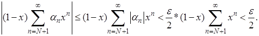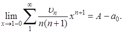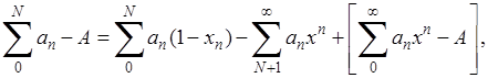 Так что “обобщенная сумма" на этот раз оказывается равной Непосредственно ясно, что рассматриваемый метод “обобщенного суммирования” является линейным. Что же касается регулярности этого метода, то она устанавливается следующей теоремой принадлежащей Абелю. 2.2 Теорема Абеля [1]Теорема. Если ряд (А) сходится и имеет сумму А (в обычном смысле), то для Доказательство. Начнем с того, что радиус сходимости ряда (1) не меньше 1, так что для