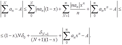 ). Естественно возникает вопрос, какие дополнительные условия надлежит наложить на поведение членов этого ряда, чтобы из (5) можно было заключить о сходимости ряда ( 2.3 Теорема ТаубераТеорема. Пусть ряд (1) сходится при 0< x<1, и имеет место предельное равенство (5). Если члены ряда (А) таковы, что