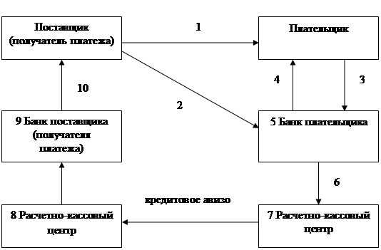 Рис 1.1 Схема движения денежных средств при расчете платежными поручениями Инкассо – это банковская операция, посредством которой банк по поручению своего клиента получает причитающиеся ему денежные средства от других организаций и предприятий на основе товарных, расчетных и денежных документов. При инкассовой услуге банк поставщика сам пересылает платежные требования-поручения в банк плательщика через органы связи спецпочтой. При взаимной договоренности между поставщиком и покупателем и их банками в целях ускорения расчетов почтовая пересылка документов из банка поставщика в банк плательщика заменяется передачей их содержания по телетайпу или телефаксу. Инкассовые услуги поставщика предоставляются клиенту за комиссионное вознаграждение. Схема расчета в данном случае следующая (см. рис. 1.2):