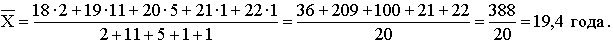 где Xi – варианта (значение) осредняемого признака или серединное значение интервала, в котором измеряется варианта; m – показатель степени средней; fi – частота, показывающая, сколько раз встречается i-e значение осредняемого признака. Приведем в качестве примера расчет среднего возраста студентов в группе из 20 человек: