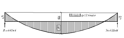Усилие в шпренгеле от предварительного напряжения: D = 0.826P·tgα = 0.826·118·0,3 = 29 кН где Р = σр Аз = 120·9,82·10-1 = 118кН – усилие затяжке от предварительного преднапряжения/ Опорный момент М0 = 0,33Рhз = 0,33·118·0,816 = 32кНм После усиления нагрузка на ригель увеличится на 97,4 – 80 = 17,4кН/м При этом усилие в затяжке повысится на величину: X = Aql2 ω = 0.509·17.4·92 ·0.061 = 44кН А в шпренгеле: в = 0.826·X·tdα = 0.826·44·0.3 ≈ 11кН. Опорный момент: М0 = 0,33Xhз = 0,33·44·0,816 ≈12кНм Коэффициент ω = 0,061 найден по [2, таб. 6] при полном загружении пролета равномерно распределенной нагрузкой q при x/l = 1. Суммарные усилия ΣD = 29 + 11 = 40 кН ΣM0 = 32 + 12 = 44кНм 1.9 Построение эпюр изгибающих моментов и перерезывающих сил в ригеле с учетом влияния затяжки Определение опорных реакций: RA = 440 – 40 = 400кН RВ = 436 –40 = 396кН Определение моментов: Млев,оп = 431 – 44= 387кН Мправ,оп = 397 - 44 = 353кН Мпр = - 387 - 97,4·4,52 ·0,5 + 40·2 + 400·4,5 = 507 кНм