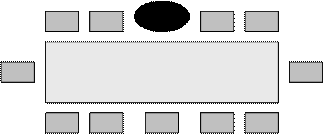 Автократичный лидер в управлении авторитарен. Он обладает достаточной властью, чтобы навязывать свою волю исполнителям, и в случае необходимости без колебаний прибегает к этому. Было установлено, что автократическое руководство обеспечивало более высокую продуктивность деятельности, но более низкую степень удовлетворенности, чем демократическое. Дуглас Мак Грегор разработал теорию лидерства, выделив руководителей двух типов «X», «Y». Согласно теории “Х”: 1. Люди изначально не любят трудиться и при любой возможности избегают работы. 2. У людей нет честолюбия, и они стараются избавиться от ответственности, предпочитая, чтобы ими руководили. 3. Больше всего люди хотят защищенности. 4. Чтобы заставить людей трудиться, необходимо использовать принуждение, контроль и угрозу наказания. Лидер такого типа, обладая достаточной властью, единолично принимает и отменяет решения, не дает возможности проявить инициативу подчиненным, категоричен, часто резок с людьми. Основное содержание его управленческой деятельности состоит из приказов и команд. Таким образом, вся власть сосредоточивается в руках такого руководителя, получившего названиеавтократа. Даже размещение сотрудников в процессе проведения совещания ориентировано на постоянный контроль их деятельности (Рис 3). Это создает напряженную обстановку, подчиненные в этом случае сознательно или интуитивно стремятся избегать тесного контакта с таким руководителем. Как правило, руководитель становится автократом тогда, когда он по своим деловым качествам стоит ниже подчиненных, которыми руководит, или если его подчиненные имеют слишком низкую общую и профессиональную культуру. Такой стиль руководства не стимулирует инициативу подчиненных, что делает невозможным повышение эффективности работы организации.