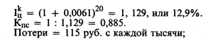 Так, если ежемесячный темп инфляции составляет 20%, то, следуя подобной методике, для периода в 50 дней соответствующие показатели будут равны: для 30-дневного периода: I Кпс = 1 : 1,2 = 0,833. Потери = 167 руб. с каждой тысячи; для 50-дневного периода: I Кпс = 1 : 2 = 0,5. Потери = 500 руб. с каждой тысячи. Сразу же обращает на себя внимание какой-то аномально высокий рост потерь (увеличение на 333 руб. с каждой тысячи), что заставляет усомниться в реальности расчетов. Ситуация еще более ухудшается, если нужно сделать расчеты для периода продолжительностью менее тридцати дней. Допустим, что нам нужно рассчитать изменение цен за 20 дней. Следуя только что описанному алгоритму, получим, что I В приведенном подходе допущена грубейшая ошибка, поскольку в расчетах необходимо использовать формулу сложных процентов и дневной индекс цен: