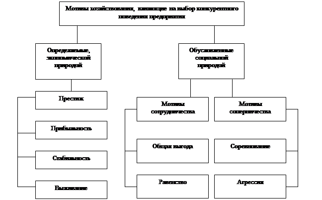 Рис. 1.2 Классификация мотивов хозяйствования Мотивы сотрудничество разделяют на критерии; - обшей выгоды, когда взаимодействие направлено на приумножение общего успеха (кооперация); - равенства, когда взаимодействие направлено на достижение равного успеха партнеров по совместному бизнесу. Мотиву соперничества, подразделяют на критерии; - соревнования, когда предприятие стремится превзойти в достижении успеха других конкурентов; - агрессии, когда деятельность предприятия направлена на снижения успеха других фирм. Вместе с тем, в настоящее время внешняя среда предприятия отличается высокой подвижностью и неопределенностью. Для удержания рыночной позиции предприятия и оперативного принятия стратегических, решений в этих условиях необходимо осуществлять постоянный мониторинг за действиями и намерениями конкурентов. В этих условиях наиболее широкое распространение получила концепция стратегического маневрирования, предложенная М, Портером. По его мнению, маневрирование используется для того, чтобы подать соперникам сигнал о том, что «худой мир лучше доброй ссоры». Вместе с тем, перечисляемое М. Портером меры и контрмеры адресованы преимущественно фирмам, которые закрепились на выгодных для них позициях и стремятся к сохранению равновесия, т.е. которого они извлекают значительные выгоды. Однако, что делать большинству отечественных машиностроительных предприятий, которые не обладают такими рыночными позициями? На наш взгляд, только активное конкурентное поведение отечественных предприятий и стратегические альянсы с более сильными соперниками будут способствовать достижению положительных результатов, не зря К. Клаузевиц писал, что «война - это продолжение политики другими средствами». Таким образом, разработка конкурентного поведения отечественного машиностроительного предприятия в условиях усиления конкуренции может быть основана на определенных принципах, разработанных военной наукой. Принципы конкурентного поведения, выработанные на основе теории и практики ведения войн, заключаются в достижении преимуществ перед конкурентами по следующим направлениям: - концентрация ресурсов; - перехватывание инициативы; - маневрирование ресурсами; - обеспечение гибкого планирования. Первый принцип - концентрация ресурсов на определенном направлении - там, где они принесут наибольший эффект целесообразно использовать в условиях ограниченности ресурсов предприятии. В одних случаях предприятию необходимо следовать за лидером, в других - направить ресурсы на обнаруженные слабые места в позиции лидеров, в-третьих, - сосредоточить ресурсы на наиболее прибыльных сегментах рынка. Второй принцип - перехватывание инициативы заключается в активных действиях, а не в реагировании на изменение условий внешней среды. Третий принцип - маневрирование ресурсами для достижения общих целей скоординированным образом, т.е. направление ресурсов на решение наиболее существенных задач предприятия, а не распыление их на второстепенные задачи конкурентной борьбы. Четвертый принцип - обеспечение гибкого планирования, чтобы предвидеть изменение условий внешней среды и действий конкурентов. Таким образом, применение принципов военной науки позволяет выделить два типа стратегий: - наступательные стратегии, при которых на основе м