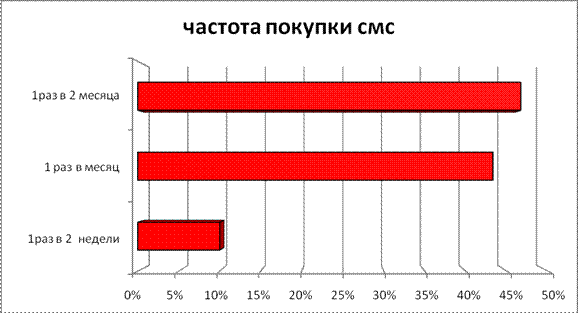 Таблица 2 Данные этой таблицы свидетельствуют о значительном колебании цены в рамках одной ассортиментной группы. Это обусловлено присутствием на обувном рынке России стиральных порошков различного уровня качества от Premium до низкокачественных смс. В ходе исследования анкета была предложена 31 индивидам. Из них в роли респондентов выступили 30 человек, поскольку остальные сами не приобретают стиральный порошок. Численность жителей г. Ярославля составляет приблизительно 600 тыс. чел. Тогда емкость рынка находится: Ёмкость рынка = 600000 * 30 / 54 Ёмкость рынка =333333 чел. 3.5 Анализ динамики спроса и построение графиков показателей рынка Спрос на смс обусловлен потребительскими предпочтениями, где решающими являются не объективные характеристики, а субъективное восприятие свойств смс – покупательская ценность, состоящая из ряда компонентов. Поэтому важно установить, по каким критериям оценивает и приобретает покупатель стиральный порошок с желательной для него комбинацией свойств. С этой целью был проведен опрос в форме анкетирования. Опрос показал, что значимость показателей, влияющих на выбор и покупку стирального у групп потребителей различных по возрасту, полу и социальному положению варьируется. 30 респондентам было предложено ответить на вопрос « Как часто Вы покупаете стиральный порошок?», на что 10% ответили, что покупают стиральный порошок 1раз в 2 недели, 43,3% респондентов покупают 1раз в месяц, 46,7% - 1раз в 2месяца.(см.рис.3) Рисунок 3