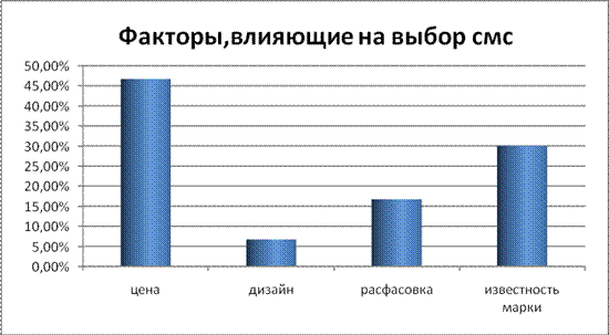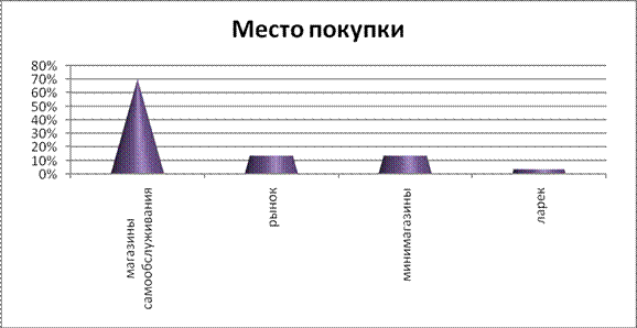 На вопрос анкеты о предпочитаемых местах покупки стирального порошка респонденты ответили следующее: 70 % - предпочитают покупать смс в магазинах самообслуживания, 13,3 % -на рынке, 13,3 % - в минимагазинах, 3,3 % - в ларьках (см. рис.8). Рисунок 8