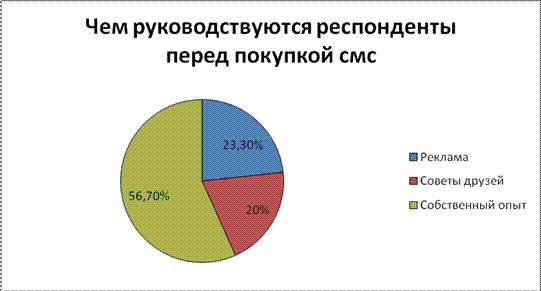 Большое влияние при покупке на респондентов оказывает реклама на телевидении и радио, реклама в прессе (23,3% респондентов). Следует отметить, что уровень доверия к информации, получаемой из непосредственного общения (знакомые, сослуживцы) иногда превышает уровень использования рекламных источников информации. Это говорит о том, что данные коммуникативные каналы имеют очень большой резерв и представляют особый интерес в силу высокого уровня доверия к ним, но в данном случае только 20% респондентов прислушиваются к мнению друзей и знакомых. Большинство людей, опрошенных в ходе данного исследования больше доверяют личному опыту (56,7%) (см. рис.7). Рисунок 7