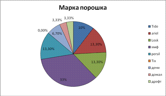 На вопрос «Какой марки порошок вы покупаете чаще всего?» Респонденты ответили: Tide – 10%, Ariel – 13,3%, Losk – 13,3%, Миф – 33%, Persil – 13,3%, Tix – 0%, Дени – 6,7%, Domal – 3,3%, Dreft – 3,3% (см. рис.9). Рисунок 9