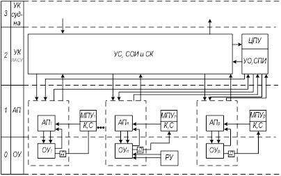 Рис. 1.3 Функциональная схема уровней автоматизации Управление приводами осуществляется с местных постов управления МПУ, оснащенных необходимой контролирующей аппаратурой. При этом возможны два вида, управления: без обратной связи по регулируемым параметрам и с обратными связями. Второй уровень автоматизации управления — управляющий-комплекс локальных систем управления, в состав которого входят собственно система управления УС, обеспечивающая выполнение операций в соответствии с заданными алгоритмами по управлению рядом объектов, а также системы обработки информации СОИ и контроля СК. В нормальных условиях локальная управляющая система ЛАСУ обеспечивает функционирование системы без участия оператора. В случае необходимости изменения режима или аварии оператор может на основе информации, получаемой от системы представления информации СПИ, подавать команды, с помощью управляющих органов УО поста управления. Пост управления может быть расположен на ходовом мостике — центральный пост управления ЦПУ — или в машинном отделении. Третий уровень автоматизации управления — управляющий комплекс судна, который обеспечивает управление совокупностью УК ЛАСУ на основе алгоритмов централизованного управления и контроля. 1.4 Конструктивное построение управляющего комплекса Особенности автоматизации судовых систем определяются не только их составом и связями между основными элементами, но и схемой размещения, а также конструктивным исполнением этих элементов. Обычно управляющая система конструктивно реализуется в виде блоков аппаратуры, расположенных в ЦПУ и МПУ, причем последние размещаются, как правило, в тех же помещениях, где находятся ОУ. В состав комплекса входят также АП, датчики и сигнализаторы. На лицевую панель ЦПУ выводятся ключи дистанционного управления системой, кнопки управления, контрольные приборы, табло и мнемосхемы. Система управления и система обработки информации могут компоноваться в виде отдельных конструктивных блоков или размещаться в пультах ЦПУ и МПУ, причем в МПУ может выполняться предварительная обработка информации, поступающей от датчиков, а также усиление сигналов управления. Связь между ЦПУ и МПУ может осуществляться по телемеханическим системам связи с электрическим, временным или частотным разделением сигналов. В системах с электрическим разделением сигналов каждый сигнал подается по своей линии связи. Такие системы просты по устройству и надежны в работе, однако при большом числе ОУ резко возрастает число подводимых кабелей, трудоемкость прокладки которых лимитирует применение систем данного вида. Системы с временным или частотным разделением требуют введения дополнительных устройств, осуществляющих телемеханические связи. Проектирование автоматизированной системы производится в соответствии с характеристиками объекта управления — вспомогательных механизмов, предназначенных для обслуживания силовых установок и судовых систем. Наиболее часто встречающимися вспомогательными механизмами являются насосы и вентиляторы. Расход пара на эти механизмы обычно составляет 10-20% общего расхода пара на судне, а в некоторых режимах - до 30%. Таким образом, вспомогательные механизмы в значительной степени определяют экономичность установки в целом. Автоматизированный эле