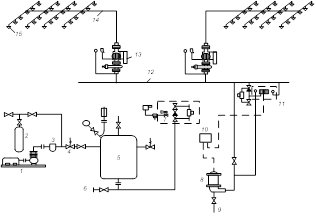 Рис. 3.2 Принципиальная схема системы орошения палубы на наливном судне До последнего времени для распыления воды применяли преимущественно перфорированные трубы, расположенные над палубным настилом с отверстиями диаметром 3-5 мм и шагом по длине трубы 150-200 мм. Рациональнее заменить эти трубы, затрудняющие перемещение по палубе, насадками с широким факелом распыла воды (рис. 3.2). Дренчеры или другие виды насадок следует размещать так, чтобы вся площадь палубы над грузовыми цистернами, грузовыми насосными отделениями и коффердамами орошалась равномерно. Поверхности орошения двух последовательно расположенных дренчеров должны частично перекрывать друг друга. Имеющиеся в настоящее время насадки при размещении их на высоте 3 м и при напоре воды перед ними, равным 5 м вод. ст., орошают 30-50 м2. Насадки могут создавать как круговой, так и секторный распыл с различной величиной угла факела. На основании описанных принципов действия системы орошения палубы водой, в рамках данного дипломного проекта: 1. выполним размещение датчиков температуры на палубе судна на уровне 25 см от пола, на крышке каждого танка (8 датчиков температуры); 2. установим запорные устройства (исполнительные механизмы) в местах размещения каждой распыляющей насадки (8 исполнительных механизмов); 3. обеспечим непрерывный мониторинг (в реальном времени) состояния датчиков температуры; 4. при несовпадении сигнала с датчика с технологическими параметрами реализуем: 4.1. автоматический и полуавтоматический запуск оросительной подсистемы; 4.2. выдачу сигналов тревоги и индикацию аварийного участка на мнемосхеме оператора. Инертный газ не только разбавляет атмосферу, но и в какой-то мере охлаждает, а также изолирует горящее вещество от кислорода атмосферного воздуха. Эти свойства инертных газов, зависящие от температуры, давления и плотности, выражены слабо, поэтому их обычно не учитывают при подсчете необходимого количества тушащей среды. Обозначим буквой к содержание кислорода по объему в атмосфере помещения, при котором прекращается горение вещества. Чтобы достичь этого, необходимо на каждый кубометр объема помещения ввести инертный газ в объеме