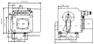 Рис. 5.3. Внешний вид и конструкция датчика ДРК-1 5.2 Выбор исполнительных механизмов Электрические исполнительные механизмы (ИМ) предназначены для перемещения регулирующих органов в системах автоматического регулирования технологическими процессами в соответствии с командными сигналами автоматических регулирующих и управляющих устройств. Выбор ИМ осуществляется в зависимости от типа регулирующего органа по требуемому моменту [8]. Так как в исследуемой системе необходимо управлять расходом вещества, то в качестве регулирующего органа применяется поворотная заслонка. Момент, развиваемый двигателем ИМ, должен быть больше реактивного момента Мреак обусловленного стремлением потока вещества закрыть заслонку, из-за необходимости учета затяжки сальников и трения в опорах. Так как момент сил трения трудно учитывать, обычно выбирают ИМ с моментом вдвое больше реактивного вращающего момента [7]: Мим = 2 где Выберем заслонку диаметром в 10 см, что соответствует диаметру прохода в седле трубопровода. Положим, что перепад давления на диске заслонки составляет Мреак = Следовательно, двигатель должен развивать момент не меньше, чем 3,43 Выберем ИМ, который удовлетворяет рассчитанным параметрам. Для управления заслонками выбираются [18] однооборотные двигатели МЭО или многооборотные МЭМ - исполнительные механизмы, которые выпускаются в комплекте с определенным типом усилителя мощности. Однооборотные ИМ типа МЭО поворачиваются на требуемый угол за указанное в маркировке время. Такой тип ИМ выпускается с концевыми выключателями, ограничивающими положение выходного вала и сигнализирующими о достижении предельных значений этого положения. Характерной особенностью двигателей типа МЭО является их высокое быстродействие, возможность длительной работы в стопорном режиме при полном напряжении питания, отсутствие ограничения по продолжительности и частоте включений. В качестве ИМ выберем МЭО-6,3/10-0,25-01 (рис. 5.3), который имеет следующие технические характеристики, представленные в таблице 5.3: Таблица 5.3 Технические характеристики исполнительных механизмов серии МЭО-6,3/10-0,25-01