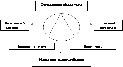 Рисунок 1.1 - Модель маркетинга организации сферы услуг Таким образом, услуги характеризуются неосязаемостью нестандартностью, несохраняемостью и неразрывностью производства и потребления. Эти характеристики создают определенные проблемы в подходах маркетинга. Для организаций обслуживания характерно применение в значительных масштабах человеческого компонента, поэтому его роль очень важна для организации обслуживания. Организация услуг обязана проводить как внешний, так и внутренний маркетинг, а также маркетинг взаимодействий. Современные теоретические модели маркетинга услуг были созданы благодаря результативному поиску общего у различных классов услуг. Как правило, ученые сходятся во мнении, что некоторые классы услуг имеют одни и те же свойства, отличающие их от товара. Практически все существующие теоретические модели маркетинга услуг основаны на предположении о том, что производство и потребление услуги происходят одновременно. Поэтому качество оказания услуг, а также навыки и знания персонала становятся ключевыми факторами успеха сервисной фирмы. Создание и поддержание системы контроля качества услуг становится важнейшей задачей маркетолога, считают исследователи. Они подчеркивают неосязаемость услуги и тот факт, что продажа услуги происходит до момента ее потребления и оценки качества полученной работы, поэтому обязанностью маркетолога становится предоставление клиенту убедительных доказательств качества услуг. Характерной чертой некоторых моделей маркетинга услуг является отношение к персоналу фирмы как к клиенту. Удовлетворение потребностей служащих способствует улучшению качества обслуживания клиентов компании, и в этом должен принимать участие маркетолог. Также одними из основных функций маркетолога становятся создание и поддержание соответствующей ожиданиям потребителя среды обслуживания. Нельзя не согласиться с большей частью этих утверждений, однако детальное изучение самых распространенных моделей маркетинга услуг демонстрирует наличие в них уязвимых положений. Это не значит, что эти исследователи ошибались; причины этого находятся в другой области. Стоит сразу сделать оговорку, что основная задача этой статьи – показать, почему возникают различные мнения относительно маркетинга услуг. Критика в данном случае – возможность показать причины, обусловленные экономическими реалиями. Процессы производства и потребления услуги не всегда одновременны. Например, обучение возможно не только лично преподавателем, но и с помощью кассет и учебников. Это означает, что в данном случае потребление услуги – обучение заказчика – будет оторвано от ее производства – составления учебников и кассет. Неосязаемость услуг относительна. Согласно определению, осязание – восприятие животными и человеком прикосновения, давления, растяжения. В основе осязания лежит раздражение различных рецепторов кожи, некоторых слизистых оболочек и преобразование клетками коры головного мозга полученной информации в соответствующий вид чувствительности. Осязаемыми могут быть медицинские, косметические, парикмахерские услуги. Неосязаемыми услугами можно назвать повышение культурного уровня человека, обучение, обработку информации и т.п. Большинство теорий маркетинга услуг считают, что технолог