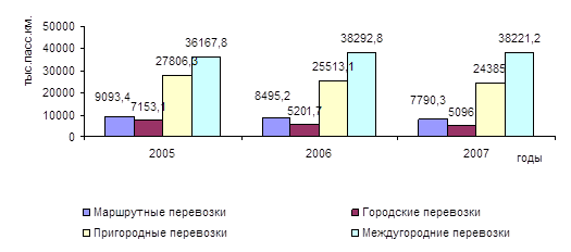 Как видно из таблицы 2.2, основные качественные показатели предприятия за отчетный период значительно не изменились. Среднее расстояние перевозки составляет 9 км. Для пригородных перевозок данный показатель превышает 15 км., а для междугородних – 75 км. Показатель среднесуточного пробега также значительно не изменился и составил в 2007 году 232 км. На этом фоне, доля рынка предприятия за отчетный период значительно сократилась. И это, в первую очередь, сказывается на снижении показателя пассажирооборота, динамика которого представлена на рисунке 2.2..