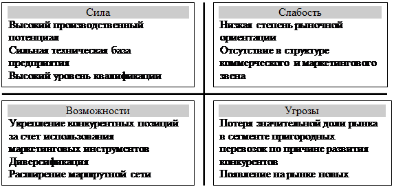 Рисунок 2.4 – Рентабельность ГУП КК "Автоколонна 1493" Как видно из рисунка 2.2, общая рентабельность ГУП КК "Автоколонна 1493" в течение всего анализируемого периода была ниже положительного уровня. Это связано, как уже отмечалось, с убыточностью городских пассажирских перевозок. В связи с резким ростом цен на бензин в 2006-2007 гг., убытки ГУП КК "Автоколонна 1493" по данной статье возросли значительно, что привело к еще большему падению уровня рентабельности. Снижение пассажиропотока в течение отчетного периода также оказало влияние на показатель рентабельности. В тоже время, содержание маршрутных такси и пригородные перевозки являются доходной статьей финансовой деятельности описываемого предприятия. 2.2 Маркетинговая среда предприятия Как уже отмечалось, подразделения, занимающегося маркетинговой деятельностью на ГУП КК "Автоколонна 1493" в настоящее время нет. В тоже время, ряд функций данной сферы на предприятии выполняются. Так, проводится определенная работа по сбору информации о рынке, в том числе, включая первичные данные. Ведется определенная работа с рекламодателями, на предмет сотрудничества с ними. Однако отсутствие какой-либо структуры и плана маркетинговой работы сводит ее эффективность к минимуму. Для определения перспектив развития маркетинговой деятельности ГУП КК "Автоколонна 1493" проведем анализ маркетинговой среды предприятия. Проведем SWOT-анализ ГУП КК "Автоколонна 1493", который позволит выявить сильные, слабые стороны автоколонны, а также ее возможности и угрозы. На рисунке 2.5 представлена матрица SWOT-анализ ГУП КК "Автоколонна 1493". Как видно из рисунка 2.5, основными сильными сторонами ГУП КК "Автоколонна 1493" в настоящее время является его высокий производственный потенциал в совокупности с опытом работы. Предприятие работает на рынке пассажирских перевозок более 30 лет и накопило значительный опыт в данной области деятельности. Предприятие располагает значительной производственно-технической базой, что позволяет ему самостоятельно проводить ремонт и техническое обслуживание имеющихся транспортных средств. Однако имеющиеся в структуре технические подразделения задействованы сегодня на 15-20%. В тоже время, такие виды услуг, как автомойка, СТО, в г. Кропоткине являются достаточно востребованными. При этом местоположение ГУП КК "Автоколонна 1493" вдоль ФАД "Кавказ" делает расширение данных видов бизнеса более привлекательным.