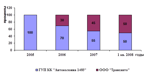 Рисунок 2.5 – Матрица SWOT-анализа ГУП КК "Автоколонна 1493" Для сравнения можно отметить, что ни одно из появившихся за последние 5-7 лет транспортных предприятий не имеет на сегодняшний день технической базы, даже минимально приближенной к базе ГУП КК "Автоколонна 1493". Основной конкурент автоколонны – ООО "Трансавто", например, осуществляет ремонт имеющегося транспорта за счет привлечения сторонних ремонтных предприятий. Это делает его работу в значительной степени зависимой от факторов внешней среды. В тоже время, практически полное отсутствие рыночной ориентации в совокупности с высокой степенью внешней зависимости, сводит на нет эффективность коммерческой работы предприятия. Значительным показателем слабой стороны ГУП КК "Автоколонна 1493" является изношенность парка автобусов. И хотя в последние несколько лет он обновлялся, средняя изношенность по парку автобусов близка к 60%. Изношенность парка напрямую влияет на комфортность, скорость перевозки которыа, в свою очередь, определяют конкурентоспособности услуги в целом. В качестве возможных угроз для описываемого предприятия можно отметить появление новых конкурентов на рынке перевозок и укрепление позиций уже существующих фирм-перевозчиков. Как показала практика, несмотря на довольно значительные экономические и юридические барьеры, существующие в настоящее время для выхода на рынок пассажирских автоперевозок, появление новых предприятий является вполне вероятным. Это подтверждает появление в г. Кропоткине в 2006 году компании "Трансавто", которая за несколько месяцев смогла занять довольно значимую долю рынка в городе и значительно повлияла на ухудшение положения ГУП КК "Автоколонна 1493". На рисунке 2.6 представлена динамика доли ГУП КК "Автоколонна 1493" на рынке городских перевозок.