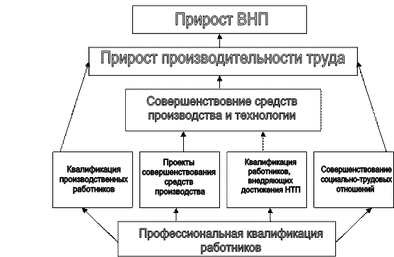 Величина трудозатрат зависит от численности занятых и от уровня их квалификации. Как показано на рисунке 1, взаимосвязь между повышением уровня квалификации и производительностью труда довольно сложна. Но, тем не менее, часть роста производительности труда зависит от уровня квалификации. Этому относительному приросту производительности соответствует определенная часть общего прироста валового национального продукта. В производстве любого продукта участвует живой труд, т.е. труд, затраченный рабочими непосредственно в самом процессе производства данного продукта, и труд прошлый, затраченный другими работниками на предыдущих стадиях производства и овеществленный в орудиях труда, зданиях, сооружениях, сырье, материалах, топливе, энергии. Соответственно этому при характеристике производительности труда используются понятия производительности индивидуального и общественного труда. Производительность индивидуального труда – результативность живого труда, как отдельного работника, так и коллектива. При оценке результативности живого труда коллектива иногда употребляют понятие локальной производительности труда, т. к. понятие индивидуальной