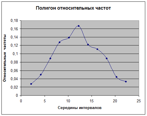 = å : 100 1,00 Статистическим распределением называется соответствие между результатами наблюдений (измерений) и их частотами и относительными частотами. Интервальное распределение – это наборы троек (Ii ; ni ; wi ) для всех номеров i, а точечное – наборы троек (xi ; ni ; wi ). Таким образом, в таблице имеются оба – и интервальное, и точечное - статистическое распределения. Далее, строим полигон и гистограмму относительных частот. Полигон.