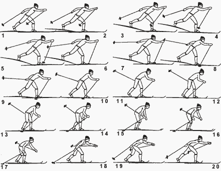 4-6. Продолжается одноопорное скольжение на левой. После отталкивания правой ногой опорная левая слегка выпрямляется, начинается движение туловища "на взлет". Правая нога слегка согнута в коленном суставе, расслаблена и находится в крайнем заднем положении, что создает хорошие условия для последующего махового выноса ее вперед. Правая рука выводит нижний конец палки вперед, а левая, расслабленная, находится в крайнем заднем положении. 7. Свободное скольжение закончено, начало махового выноса правой ноги вперед. Правая палка ставится на снег, а левая начинает выноситься вперед. 8. Начало толчка почти выпрямленной правой рукой. Палка находится под углом - это позволяет сразу начать эффективное отталкивание. Продолжаются вынос левой палки вперед, выпрямление опорной ноги в коленном суставе и маховый вынос правой ноги вперед. 9-13. Скольжение с опорой на палку. В первой фазе отталкивания правая рука, сгибаясь в локтевом суставе, усиливает толчок, левая энергично выносится вперед. Несмотря на выпрямление опорной ноги, вследствие сильного нажима правой рукой на палку давление на опорную лыжу не увеличивается, а может даже уменьшаться, что способствует поддержанию скорости. Начинается наклон туловища вперед. 14. Момент окончания скольжения с выпрямлением ноги. Опорная нога почти полностью выпрямляется, маховая приближается к ней, а лыжа опускается на снег. Создается жесткая опора: система "рука - туловище - опорная нога". С целью предупреждения раннего переката таз вперед не выводится. Туловище максимально наклонено вперед. Уменьшается угол отталкивания правой рукой, что значительно увеличивает горизонтальную составляющую силу толчка, продолжается вынос вперед левой палки.