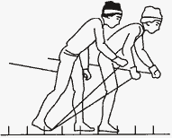 15-16. Правая нога поравнялась с левой ногой, началось отталкивание с разгибанием в тазобедренном суставе. Уменьшается угол сгибания ноги в колене - момент подседания. Правая рука продолжает отталкивание (в это время усилие на палку максимальное), левая энергичным движением выносится вперед. Так выводится вперед и одновременно начинается постепенная загрузка маховой ноги. 17-18. Продолжается отталкивание левой ногой с выпрямлением в коленном суставе и загрузка маховой ноги. Правая рука заканчивает толчок, а левая вынесена вперед. 19. Продолжается толчок левой ногой. Правая рука после окончания толчка, расслабленная по инерции, отбрасывается назад. 20. Закончен толчок ногой, его направление по линии голень-бедро-туловище вызывает движение тела вперед-назад и сохранение скорости движения в фазе одноопорного скольжения. Окончена половина цикла. Во второй его части все движения рук и ног повторяются в такой же последовательности, и заканчивается весь цикл хода. Попеременный двухшажный ход, несмотря на привычную (как при ходьбе без лыж) перекрестную координацию, довольно сложен и требует значительного количества времени на его освоение. Наличие фазы скольжения, необходимость координировать по времени работу рук и ног, изменение ритма движения при преодолении подъемов создают определенные трудности в овладении этим ходом.