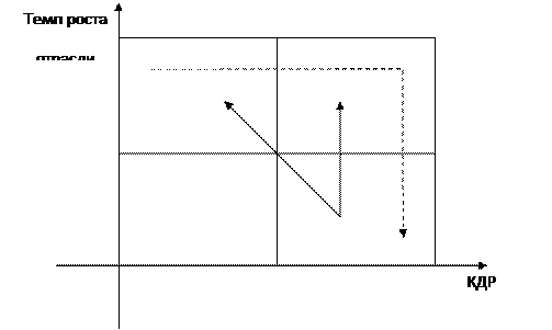 где, СХП - стратегическое хозяйственное подразделение. "Звезда" - высокая доля в быстрорастущей отрасли. СХП занимает лидирующее положение на рынке. Производство джинсовых изделий приносит большие доходы, но большую часть доходов фирма вынуждена тратить на разработку новых технологий, при освоении новых изделий, на рекламную кампанию, выставки, ярмарки, т.е. на поддержание своего преимущества. КДР равен 1.7, следовательно, данное СХП занимает положение "звезд". Маркетинговая стратегия ориентируется на снижение цен, увеличение ассортимента товара, внедрение новых технологий. "Дойные коровы" - высокая доля в стабильной или стареющей отрасли. СХП занимает лидирующее положение, имеет высокие, устойчивые прибыли, на конкурентную борьбу идут не слишком большие средства, т.к. фирма известна на рынке, что не позволяет более мелким конкурентам втиснуться в стабильную отраслевую структуру. КДР равен 2.0, следовательно, СХП занимает положение "дойных коров". Все подразделения СХП приносят фирме высокую прибыль, т.е. фирма имеет избыток финансовых средств. Маркетинговая стратегия заключается в жестком контроле капитальных вложений, поддержании каналов сбыта. "Трудный ребенок" - низкая доля в быстрорастущей отрасли. Ситуация в этом случае "либо - либо": либо изыскивает средства наращивать мощности, и становиться звездой, либо уходить с рынка. Собственных средств на развитие не хватает, поэтому нужна поддержка "дойных коров". КДР равен 1.1, следовательно, данное СХП занимает положение "трудного ребенка". Маркетинговая стратегия фирмы ориентирована на увеличение расходов, на развитие производства, повышение его технологичности для того, чтобы успеть завоевать значительную долю рынка до того, как к продукции фирмы иссякнет потребительский интерес или уйти с рынка. "Собаки". СХП имеет низкую долю в слабо растущей или стабилизирующейся отрасли. У них наихудшее положение: доходов нет, необходимо изыскивать дополнительные средства для поддержания своего положения. КДР равен 0.8, следовательно, данное СХП занимает положение "собаки". Варианты стратегий: стремиться выйти на узкоспециализированный рынок, чтобы стать там лидером, в противном случае - уход с рынка. Матрица БКГ.