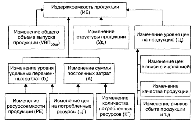 b - уровень переменных расходов на единицу продукции(услуг); А - абсолютная сумма постоянных расходов на весь выпуск продукции. Далее проводится факторный анализ общей суммы затрат с делением затрат на постоянные и переменные. В процессе анализа необходимо также оценить изменения в структуре по элементам затрат. Если доля заработной платы уменьшается, а доля амортизации увеличивается, то это свидетельствует о повышении технического уровня предприятия, о росте производительности труда. Удельный вес зарплаты сокращается и в том случае, если увеличивается доля комплектующих деталей, что свидетельствует о повышении уровня кооперации и специализации предприятия. 2.2 Методика анализа издержкоемкости продукцииИздержкоемкость (затраты на рубль произведенной продукции) — очень важный обобщающий показатель, характеризующий уровень себестоимости продукции в целом по предприятию. Во-первых, он универсален: может рассчитываться в любой отрасли экономики и, во-вторых, наглядно показывает прямую связь между себестоимостью и прибылью. Исчисляется данный показатель отношением общей суммы затрат на производство и реализацию продукции (Зобш ) к стоимости произведенной продукции в действующих ценах. При его уровне ниже единицы производство продукции является рентабельным, при уровне выше единицы — убыточным. В процессе анализа следует изучить выполнение плана и динамику издержкоемкости продукции, а также провести межхозяйственные сравнения по этому показателю. Необходимо также изучить изменение уровня издержкоемкости продукции по отдельным элементам затрат. После этого нужно установить факторы изменения общей издержкоемкости, отраженные на рисунке 2.2.1