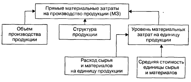 объема ее производства После этого более детально изучают себестоимость продукции по каждой статье затрат, для чего фактические данные сравнивают с данными плана, прошлых периодов, других предприятий. В результате постатейного анализа себестоимости продукции должны быть выявлены внутренние и внешние, объективные и субъективные факторы изменения ее уровня. Это позволит выявить резервы сокращения затрат. 2.4 Методика анализа прямых материальных затрат Большой удельный вес в себестоимости продукции занимают материальные затраты. Общая сумма материальных затрат в целом по предприятию зависит от объема производства продукции (V), ее структуры (Уi) и изменения удельных материальных затрат на отдельные виды продукции (УМЗ ). Уровень последних в свою очередь может измениться из-за количества (массы) расходуемых материальных ресурсов на единицу продукции(Рм ) и средней стоимости единицы материальных ресурсов(Цм )