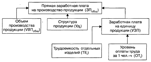 Общая сумма прямой зарплаты (рис. 2.5.1) зависит от объема производства продукции, ее структуры и уровня затрат на отдельные изделия. Последний, в свою очередь, определяется трудоемкостью и уровнем оплаты труда за 1 чел.-ч.