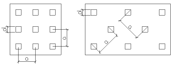 gк – коэффициент надёжности, равный 1,4 – для фундаментов опор мостов при низком ростверке, сваях или сваях-стойках; при высоком ростверке – только при сваях-стойках, воспринимающих сжимающую нагрузку, независимо от числа свай, если несущая способность сваи определена расчетом. 5.2 Определение количества свай и размещение их в ростверке Проектирование свайных фундаментов ведется по расчетным нагрузкам с учетом различных сочетаний. Все нагрузки каждого сочетания следует привести к уровню подошвы ростверка, учитывая при этом его вес. После приведения нагрузок к уровню подошвы ростверка, необходимое, ориентировочное количество свай n определяют по формуле n = k∙ где k – корректирующий коэффициент, учитывающий влияние изгибающего момента, принимается k=1,1…1,4; N – максимальное нормальное усилие в уровне подошвы ростверка, кН; Gp – вес ростверка (предварительно определённый), кН. Сваи можно размещать в рядовом (рисунок 5.1,а) или шахматном порядке (рисунок 5.1,б). а) б)