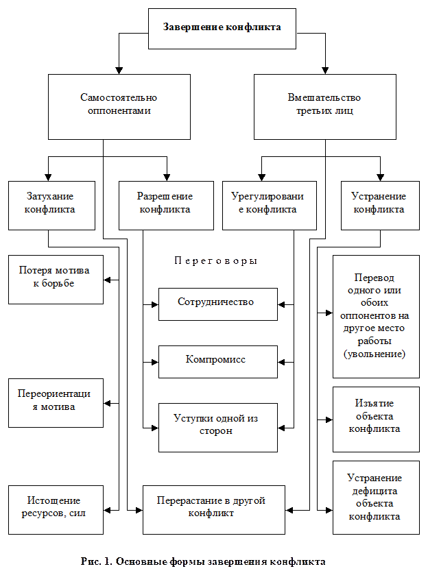 Урегулирование конфликта - отличается от разрешения тем, что в устранении противоречия между оппонентами принимает участие третья сторона. Ее участие возможно как с согласия противоборствующих сторон, так и без их согласия. Затухание конфликта - это временное прекращение противодействия при сохранении основных конфликта: противоречия и напряженных отношений. Конфликт переходит из “явной” формы в скрытую. Затухание конфликта обычно происходит в результате: · истощение ресурсов обеих сторон, необходимых для борьбы; · потери мотива к борьбе, снижения важности объекта конфликта; · переориентации мотивации оппонентов (возникновение новых проблем, более значимых, чем борьба в конфликте). Под устранением конфликта понимают такое воздействие на него, в результате которого ликвидируются основные структурные элементы конфликта. Несмотря на “неконструктивность” устранения, существуют ситуации, которые требуют быстрых и решительных воздействий на конфликт (угроза насилия людей, дефицит времени или материальных возможностей). Устранение конфликта возможно с помощью следующих способов: - изъятие из конфликта одного из оппонентов (перевод в другой отдел, филиал; увольнение с работы); - исключение взаимодействия оппонентов на длительное время (отправка в командировку одного или обоих и т.п.); - устранение объекта конфликта (мать забирает у ссорящихся детей игрушку, из-за которой возник конфликт); - устранение дефицита объекта конфликта (у третьей стороны есть возможность обеспечить каждую из конфликтующих сторон объектом, к обладанию которым они стремились). Перерастание в другой конфликт происходит, когда в отношениях сторон возникает новое, более значимое противоречие и происходит смена объекта конфликта. Однако, независимо от подхода, при разрешении конфликта следует руководствоваться со следующими психологическими принципами. 1) Разрешение конфликта с учетом сущности и содержания противоречия. В этом случае надо: · определить его деловую основу; · уяснить истинные, а не декларативные мотивы вступления людей в конфликт. Разрешение конфликта существенно осложняется, если руководитель сам является представителем одной из противоборствующих сторон. В этом случае ему трудно быть объективным и конфликт принимает публичный характер и выходит за рамки организации. 2. Разрешение конфликта с учетом его целей. Крайне важно быстро определить цели конфликтующих сторон, провести четкую границу между особенностями межличностного и делового взаимодействия. Если личностные цели являются доминирующими, то целесообразно к оппоненту применить сначала меры воспитательного воздействия, выдвинуть определенные жесткие требования. Если один из оппонентов имеет более высокий ранг по отношению к другому, то ему следует указать на необходимость придерживаться определенных норм поведения. 3. Разрешение конфликта с учетом эмоциональных состояний. Если конфликт принял эмоциональный характер и сопровождается бурными реакциями, то целесообразно показать на конкретных примерах, как высокая напряженность влияет на результативность работы, как оппоненты теряют свою объективность, как у них снижается критичность. Иными словами, необходима разъяснительная беседа в спокойной и доверительной обстановке. 4. Разрешение конфликта с учетом о