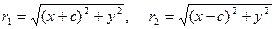 Мы должны убедиться в том, что уравнение (1.9), полученное путем алгебраических преобразований уравнения (1.8), не приобрело новых корней. Для этого достаточно доказать, что для каждой точки М, координаты х и у которой удовлетворяют уравнению (1.9), величины r1 и r2 удовлетворяют соотношению (1.7). Проводя рассуждения, аналогичные тем, которые были сделаны при выводе формул (1.6), найдем для интересующих нас величин r1 и r2 следующие выражения: