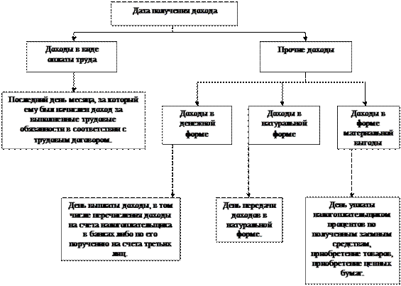 Схема 1.2.2. Дата фактического получения доходов Согласно пункту 1 статьи 53 НК РФ, налоговая ставка – это величина налоговых начислений на единицу измерения налоговой базы. Налоговая ставка по налогу на доходы физических лиц установлена в виде размера процента, который следует применить к налоговой базе при исчислении суммы налога. Порядок взимания налога на доходы с физических лиц регламентируется главой 23 Налогового Кодекса РФ и составляет 13% в отношении всех видов доходов. Исключение составляют доходы, полученные в виде дивидендов (облагаются по ставке 9%), доходы лиц, не являющихся резидентами Российской Федерации (облагаются по ставке 30%), доходы в виде выигрышей в конкурсах, играх и других рекламных мероприятиях, превышающие сумму 2000 рублей, и некоторые другие виды доходов (облагаются по ставке 35%).Ставка налога, которую надо применить при исчислении налога, зависит не от размера дохода, а от вида дохода. Статья 210 НК РФ содержит специальную оговорку, что налоговая база определяется отдельно по каждому виду доходов, в отношении которых установлены различные налоговые ставки. Порядок исчисления налога на доходы с физических лиц предусматривает определение суммы налога путем умножения налоговой базы на соответствующую ставку, выраженную в долях единицы. Общую формулу определения величины налога можно представить в следующем виде: (налоговая база) = (объект налогообложения в денежном выражении) – (налоговые вычеты); (налог на доходы физических лиц) = (налоговая база) х (ставка налога в процентах) / 100 Пунктом 4 статьи 210 НК РФ установлено, что при исчислении налоговой базы по доходам, в отношении которых предусмотрены налоговые ставки 30% и 35%, налоговые вычеты не применяются. В таких случаях в приведенной формуле налоговые вычеты будут равны нулю. Особенностью взимания НДФЛ является то, то его могут исчислять и уплачивать как налоговые агенты, так и сами налогоплательщики. На сегодняшний день порядок уплаты НДФЛ в бюджет един для всех субъектов Федерации, его устанавливает статья 226 НК РФ. Налоговые агенты - организации, индивидуальные предприниматели и постоянные представительства иностранных организаций в РФ перечисляют налог в региональный бюджет по месту своей регистрации и по местонахождению своих обособленных подразделений. В пункте 2 статьи 226 НК РФ содержится перечень ряда доходов, являющихся исключением из данного положения, т.е. определены ситуации, когда источник выплаты дохода не несет функции налогового агента. Это: доходы, полученные физическими лицами от предпринимательской деятельности, доходы от частной практики частных нотариусов и других лиц, занимающихся частной практикой в соответствии с действующим законодательством, доходы физического лица по договорам гражданско-правового характера, заключенных с другим физическим лицом, доходы физических лиц – налоговых резидентов РФ, полученные от источников за пределами Российской Федерации, доходы, при выплате которых у налогового агента нет возможности удержать налог (например, при выплате доходов в натуральной форме).Законодательством устанавливаются четкие правила исчисления, удержания и перечисления налога для налогового агента: налог по ставке 13% исчисляется нарастающим итогом с начала налогового периода по итогам каждого месяца применительно