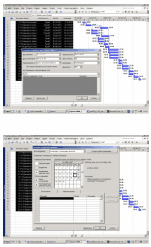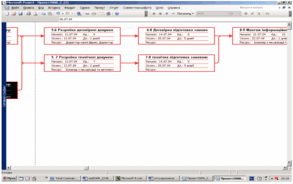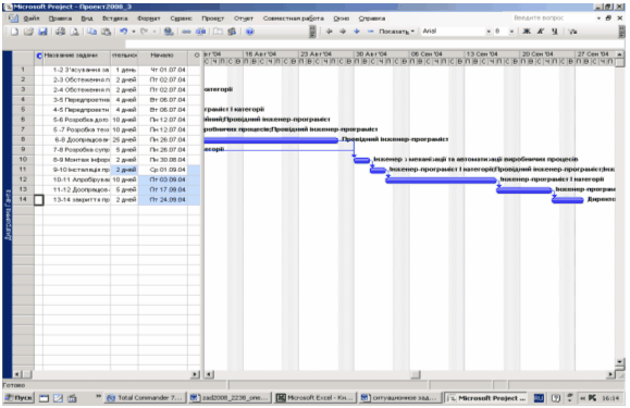 Таким чином, на виконання 1 та 5 стандартного проекту потрібні, при наявності в підприємстві: 1. Ресурси директора підприємства (за 3 місяці): 1 проект = 88 н/часів 5 проектів = 440 н/часів Фонд за 3 місяці = 164*3 =492 н/ч 2. Ресурси 5 інженерів-програміст І категорії (за 3 місяці): 1 проект = 120 н/часів 5 проектів = 600 н/часів Фонд 5 програмістів за 3 місяці = 96*3*5 =1440 н/ч 3. Ресурси 2 інженерів з механізації та автоматизації виробничих процесів (за 3 місяці): 1 проект = 80 н/часів 5 проектів = 400 н/часів Фонд за 3 місяці = 60*3*2 =360 н/ч 4. Ресурси провідного програміста підприємства (за 3 місяці): 1 проект = 48 н/часів 5 проектів = 240 н/часів Фонд за 3 місяці = 164*3 =492 н/ч 5. Ресурси комерційного директора підприємства (за 3 місяці): 1 проект = 64 н/часів 5 проектів = 320 н/часів Фонд за 3 місяці = 164*3 =492 н/ч Таким чином, для виконання 6-го індивідуалізованого проекту можуть бути використані резервні фонди: 1. Комерційного директора – 160 н/часів за 3 місяці 2. Провідного програміста – 252 н/ч за 3 місяці 3. 3 програмістів 1 категорії – 840 н/ч, які потрібно використати наступним шляхом: - звільнити 1 програміста та взяти замість нього на роботу 1 інженера з механізації та автоматизації виробничих процесів; - або перекваліфікувати 1 програміста на виконання функцій інженера з механізації та автоматизації виробничих процесів; Це дозволить подолати дефіцит нормо часів потрібних робіт інженерів з механізації та автоматизації виробничих процесів. Розраховуємо графіки проекту індивідуалізованого заказу по автоматизації з врахуванням попередніх розрахунків. Таблиця 2.5 Розраховані строки виконання індивідуалізованого проекту (роботи, строки) в MS PROJECT (спроектований по плановому строку закінчення – 27.09.2004)