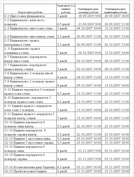 Таблиця 1 Результати розрахунку календарного плану робіт проекту в Microsoft Project – 2007 (планування по даті закінчення робіт, 2-і зміни, нестандартний календар 6-денної робочої неділі)
